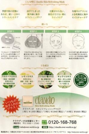高級シートマスク「claudio Skin Refreshing Mask」の無料モニターを20名募集致します! と言う高確率の中で当選しました。